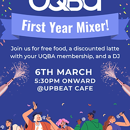 Kick off your university journey with the UQ Business Association’s First Year Mixer! 🥳 Meet new friends, network with fellow first years, and get to know more about the UQBA community.🥂