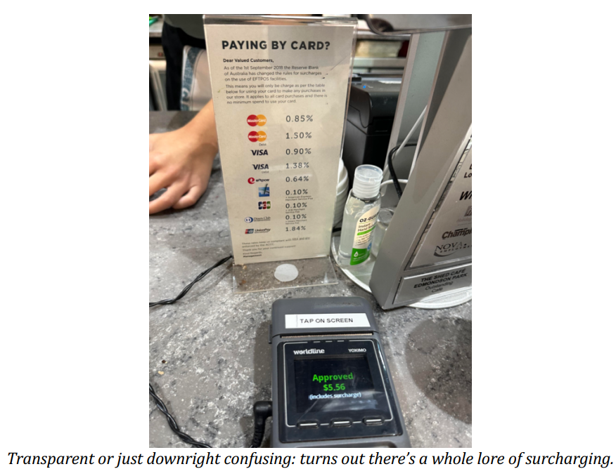 Why does Australia permit charges, you ask? The RBA tells us that surcharging “encourages consumers to use less expensive payment