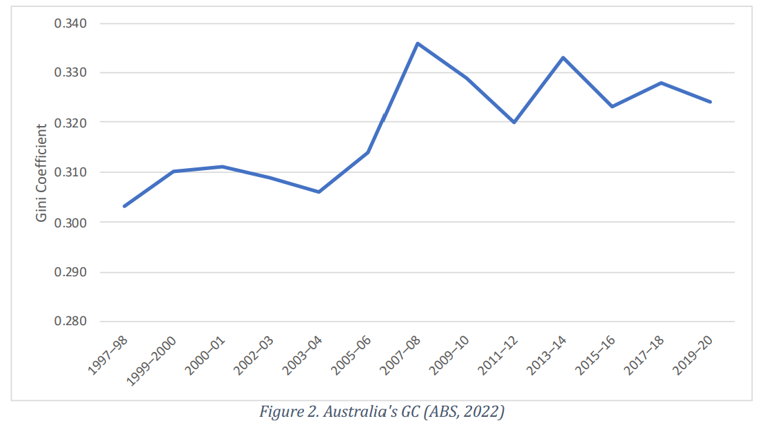 using the Gini Coefficient (GC), which ranges from 0 (complete equality) to 1 (complete inequality). Australia’s GC before any
