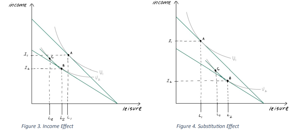 hours worked to minimise decreases to income level, consequently decreasing leisure from L1-L2. In Figure 4, substitution effect dominates